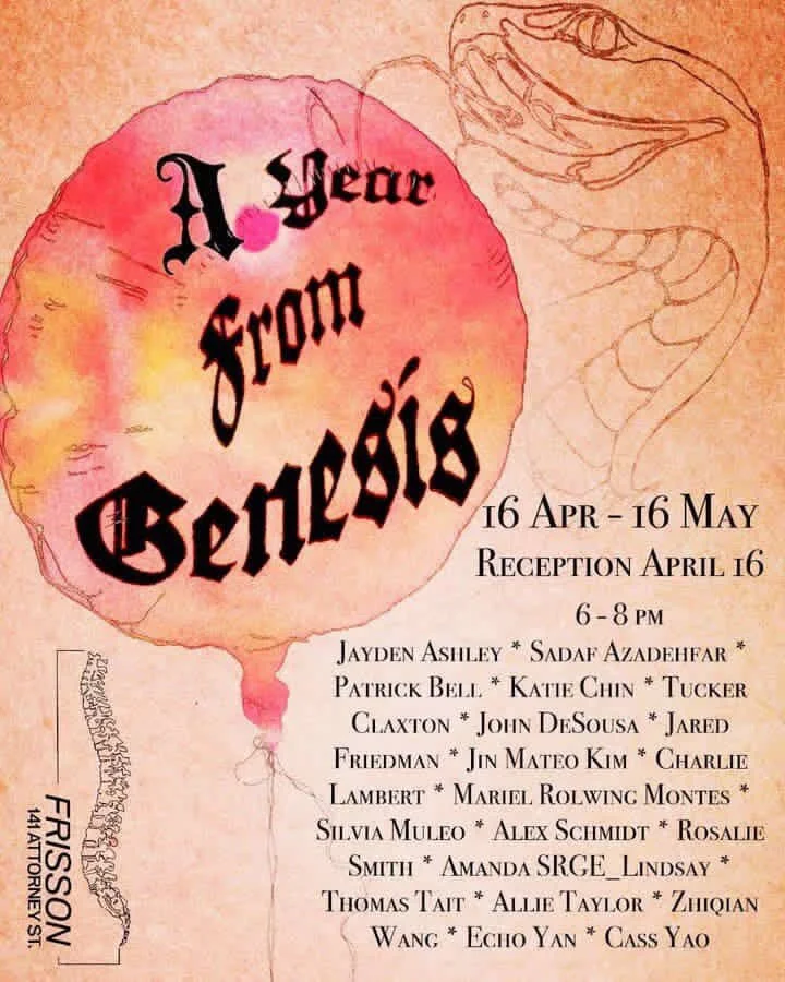FRISSON is pleased to present A YEAR FROM GENESIS, a performance series and a reunion group show organized on the occasion of the gallery’s 1 year anniversary. While the concept of FRISSON was born from a Lower East Side Craigslist listing, 141 Attorney Street, in turn, has had many past lives as a laundromat, as a different gallery, and as a test kitchen. On April 7, the keys unlocked 141 Attorney Street. After a whirlwind renovation period, FRISSON opened in May of 2025. That was 6 shows, 22 artists, and many events ago.